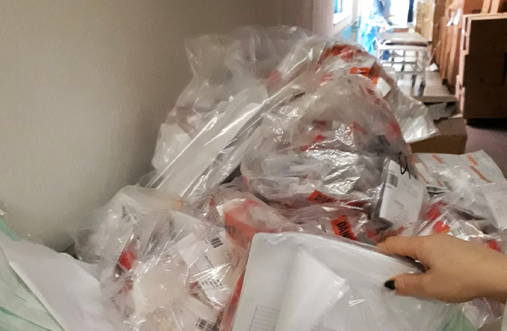 Στην πιο πάνω εικόνα φαίνονται οι σακούλες έξω απο τα εργαστήρια, γεμάτες με δείγματα για μοριακό τεστ κορωνοϊού.
