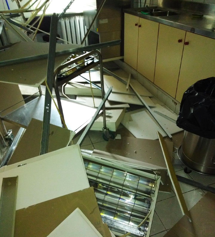 Όταν άκουσαν το θόρυβο, η μία εργαζόμενη πρόλαβε και άνοιξε τη πόρτα. Αυτό τίς έσωσε, καθώς η ψευδοροφή βρήκε εμπόδιο στη πόρτα. Καταπλακώθηκαν όμως οι τραπεζοκόμες και τραυματίσθηκαν. Ο πρόεδρος της ΠΟΕΔΗΝ Μιχάλης Γιαννάκος σημειώνει πως η μία εργαζόμενη τραυματίστηκε πιο σοβαρά και νοσηλεύεται ευτυχώς εκτός κινδύνου.