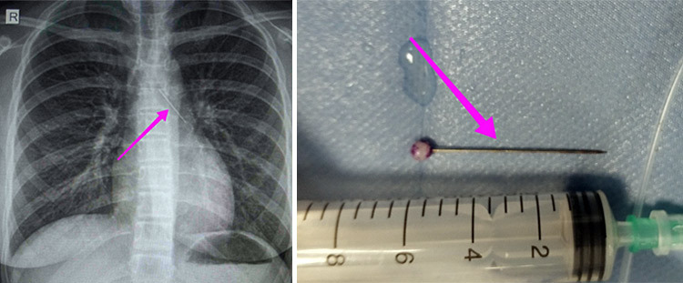 Ανήλικη προσήλθε χθες στο Τ.Ε.Π. του Γ.Ν.Θ. «Ιπποκράτειο», συνοδευόμενη από τους γονείς της, μετά από αναφερόμενη κατάποση ξένου σώματος (καρφίτσα). Από την απεικονιστική διερεύνηση που πραγματοποιήθηκε με ακτινογραφία θώρακος αρχικά και ακολούθως με αξονική τομογραφία θώρακος, διαπιστώθηκε η ύπαρξη αιχμηρού μεταλλικού ξένου σώματος στην αναπνευστική οδό (αριστερός κύριος βρόγχος) και όχι στην πεπτική οδό.