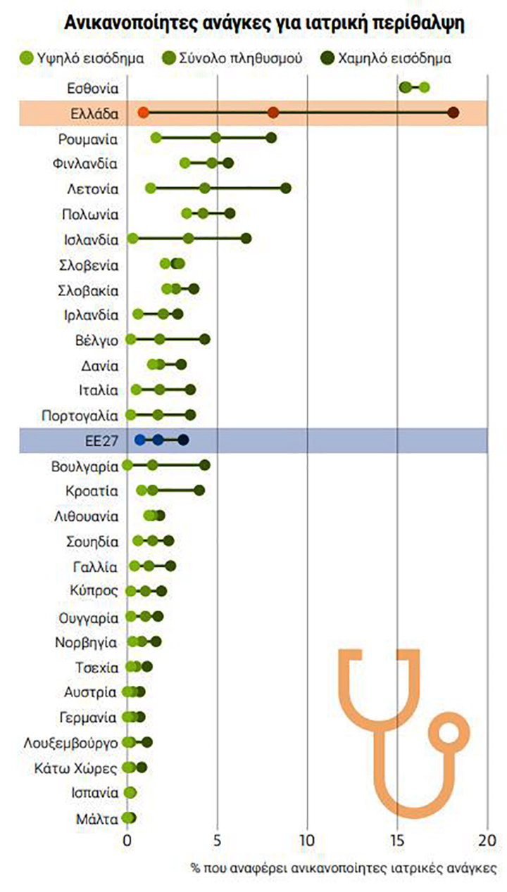 Όπως φαίνεται στον πίνακα που ακολουθεί, το 2019, η Ελλάδα κατέγραψε το δεύτερο υψηλότερο επίπεδο στην ΕΕ μετά την Εσθονία: το 8,1% του ελληνικού πληθυσμού ανέφερε μη καλυπτόμενες ανάγκες λόγω κόστους, απόστασης που πρέπει να διανυθεί ή χρόνου αναμονής, σε σύγκριση με 1,7% κατά μέσο όρο σε επίπεδο ΕΕ.