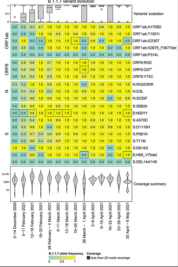 Εικόνα: Αποτίμηση της εξέλιξης των 20 μεταλλάξεων που χαρακτηρίζουν το στέλεχος Άλφα (B.1.1.7) στη περίοδο μελέτης, όπως αυτή προκύπτει από το lineagspot. Πέρα από τις πληροφορίες συγκέντρωσης της εκάστοτε μετάλλαξης, για την αποτίμηση λαμβάνονται υπόψη τόσο παράμετροι ποιότητας της αρχικής πληροφορίας (κάτω) όσο και της συνολικής κατανομής των μεταλλάξεων ανά χρονική στιγμή (πάνω).
