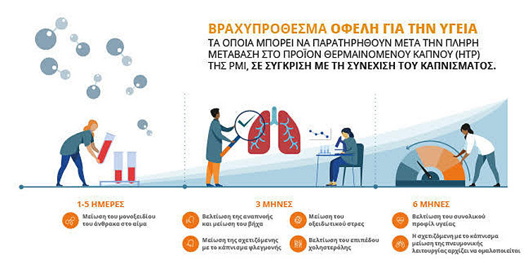 - Λίγες ημέρες μετά τη μετάβαση από τα τσιγάρα σε ένα προϊόν θέρμανσης καπνού, το σώμα εκτίθεται σε χαμηλότερα επίπεδα CO. Το προϊόν αυτό παράγει κατά μέσον όρο 98% λιγότερο CO σε σύγκριση με τα τσιγάρα. Στις κλινικές μελέτες της παρασκευάστριας εταιρείας (Philip Morris International) που πραγματοποίησαν οι Luedicke και συν. και οι Haziza και συν., οι συμμετέχοντες που μετέβησαν από τα τσιγάρα προϊόν αυτό, εμφάνισαν σημαντική μείωση του επιπέδου του CO στο αίμα μόλις 24 ώρες μετά την αλλαγή. Η μείωση αυτή ήταν σχεδόν ίδια με τη μείωση που παρατηρείται στα άτομα που διακόπτουν το κάπνισμα.