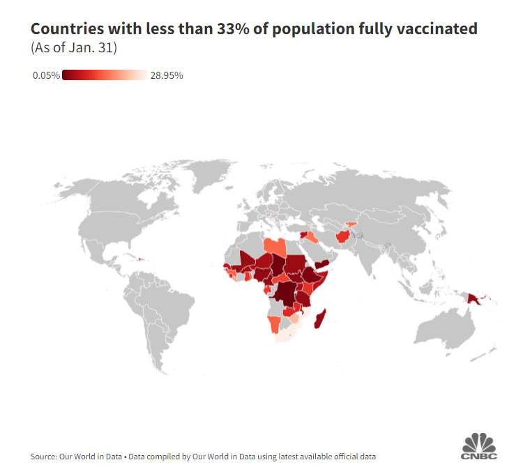 Η Νότια Αφρική, όπου εντοπίστηκε για πρώτη φορά πέρσι το εξαιρετικά μεταδοτικό στέλεχος 'Ομικρον του ιού, έχει εμβολιάσει λιγότερο από το ένα τρίτο του πληθυσμού της. Εν τω μεταξύ, λιγότεροι από ένας στους τρεις ανθρώπους στις χώρες της Καραϊβικής, Τζαμάικα, Αγία Λουκία και Άγιο Βικέντιο και Γρεναδίνες έχουν εμβολιαστεί κατά της Covid.