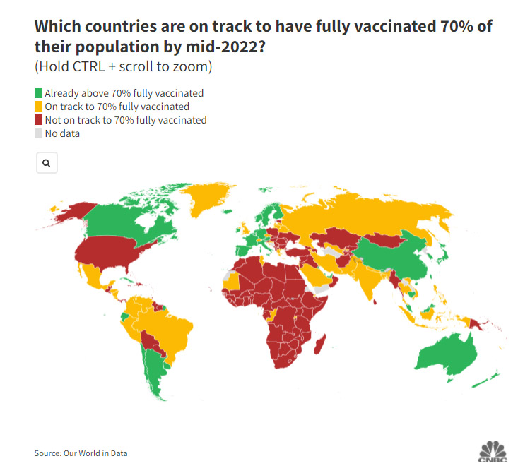 Τον Οκτώβριο, ο Παγκόσμιος Οργανισμός Υγείας έθεσε στόχο για τις χώρες να εμβολιάσουν το 70% του πληθυσμού τους έως τα μέσα του 2022, αλλά πολλές χώρες υστερούν από το συγκεκριμένο ποσοστό. Την περασμένη εβδομάδα, ο Γενικός Διευθυντής του ΠΟΥ Τέντρος Αντανόμ Γκεμπρεγέσους είπε ότι ο Covid θα μπορούσε να πάψει να αποτελεί παγκόσμια έκτακτη απειλή για την υγεία το 2022, εάν ληφθούν ορισμένα μέτρα - συμπεριλαμβανομένης της διασφάλισης της δίκαιης πρόσβασης στα εμβόλια.