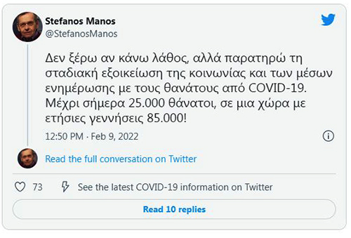 "Δεν ξέρω αν κάνω λάθος, αλλά παρατηρώ τη σταδιακή εξοικείωση της κοινωνίας και των μέσων ενημέρωσης με τους θανάτους από COVID-19. Μέχρι σήμερα 25.000 θάνατοι, σε μια χώρα με ετήσιες γεννήσεις 85.000!", γράφει στο Twitter.
