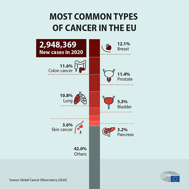 Αν και η Ευρώπη αντιπροσωπεύει λιγότερο από το 10% του παγκόσμιου πληθυσμού, αντιστοιχεί στο 25% όλων των περιπτώσεων καρκίνου. Οι διαφορές στα ποσοστά επιβίωσης από καρκίνο στις χώρες της ΕΕ ξεπερνούν το 25%. Σχεδόν το 75% όλων των διαγνώσεων καρκίνου στην ΕΕ αφορούν άτομα ηλικίας 60 ετών και άνω. Οι πιο κοινοί τύποι καρκίνου στην Ευρωπαϊκή Ενωση ήταν το 2020, του μαστού (12,1%), του παχέος εντέρου (11,6%), του προστάτη (11,4%), του πνεύμονα (10,8%), της ουροδόχου κύστης (5,3%), του δέρματος (3,6%), του παγκρέατος (3,2%) και οι λοιποί 42%. Συνολικά οι νέες περιπτώσεις καρκίνου που διαγνώστηκαν το 2020 ήταν 2.948.369.