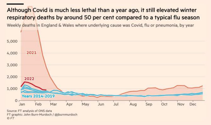 Ωστόσο, η ταχύτητα με την οποία η Όμικρον μολύνει τους ανθρώπους εξακολουθεί να ανεβάζει τον συνολικό αριθμό θανάτων αυτό τον χειμώνα, σε 9.641 από την πρώτη εβδομάδα του Ιανουαρίου. Είναι 50% υψηλότερα από ό,τι σε μια τυπική περίοδο γρίπης παρά τα χαμηλότερα επίπεδα κοινωνικής συναναστροφής, σύμφωνα με τα στοιχεία της βρετανικής Στατιστικής Υπηρεσίας.