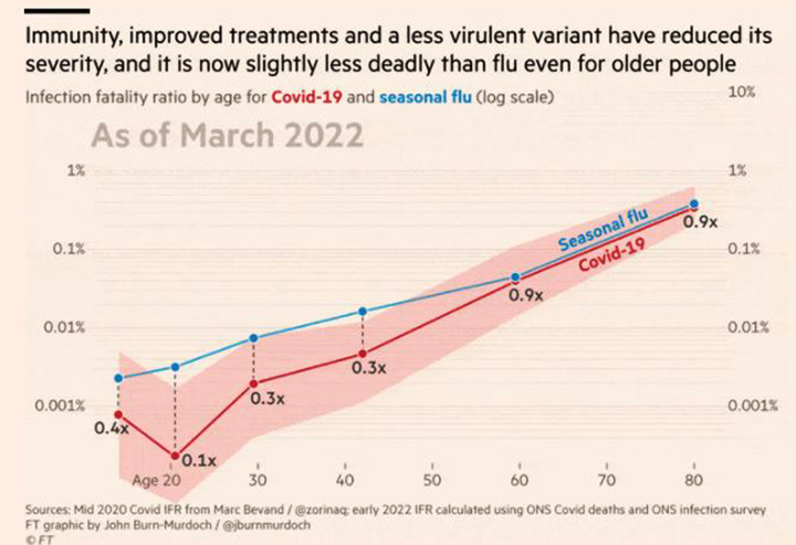 Για κάθε 100.000 λοιμώξεις Όμικρον, 35 θα οδηγήσουν σε θάνατο, ενώ ο αντίστοιχος αριθμός λοιμώξεων από γρίπη θα οδηγήσει σε 40 θανάτους, έδειξαν τα στοιχεία. Ακόμη και μεταξύ των άνω των 80 ετών, όπου περίπου μία στις 200 λοιμώξεις από Όμικρον εξακολουθεί να καταλήγει σε θάνατο, αυτό το ποσοστό είναι τώρα χαμηλότερο από το αντίστοιχο για τη γρίπη.