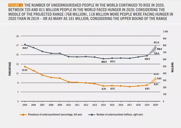 Στην έκθεση του 2021 για την κατάσταση της επισιτιστικής ασφάλειας και της διατροφής στον κόσμο - μια συνεργασία μεταξύ πέντε υπηρεσιών του ΟΗΕ - οι συγγραφείς αναγνωρίζουν ότι η επίτευξη αυτού του στόχου έχει γίνει πιο δύσκολη. Μεταξύ 720 και 811 εκατομμυρίων ανθρώπων στον κόσμο αντιμετώπισαν πείνα το 2020, δηλαδή περίπου ένας στους 10, σύμφωνα με εκτιμήσεις του ΟΗΕ.