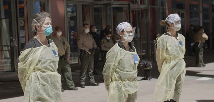 - Το "The First Wave" (φωτογραφία πάνω) του Mathew Heineman για το National Geographic. Οι ήρωές του είναι εργαζόμενοι στον τομέα της υγείας κατά το πρώτο κύμα πανδημίας στη Νέα Υόρκη, την άνοιξη του 2020. "Να κοιτάς στα μάτια τον θάνατο καθημερινά, αλλά, τι τρομακτικό, να σε κοιτά κι αυτός πίσω". Στιγμές σιωπής όταν χάνεται η μάχη για τη ζωή ενός ασθενούς, σωματική και ψυχική εξάντληση του υγειονομικού προσωπικού, σε συνδυασμό και με τους δικούς τους φόβους για πιθανή μόλυνση. Αλλά και γενέθλια που γιορτάζονται μέσω zoom, μια φράση του Αλμπέρ Καμύ σε μια διαφάνεια διαδικτυακού σεμιναρίου, το "Here Comes the Sun" των Beatles ως η θριαμβευτική μελωδία κάθε φορά που γίνεται μια επιτυχημένη διασωλήνωση.