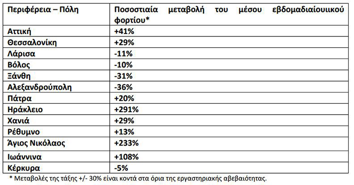 Καθαρά αυξητικές τάσεις παρατηρήθηκαν στην Περιφέρεια Αττικής (+41%), στα Ιωάννινα (+108%), στον Άγιο Νικόλαο (+233%) και στο Ηράκλειο (+291%). Οριακή ήταν η αύξηση στην Πάτρα (+20%), στο Ρέθυμνο (+13%), στα Χανιά (+29%) και στη Θεσσαλονίκη (+29%).