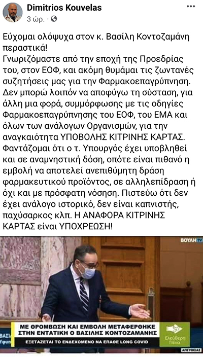 Δεν μπορώ λοιπόν να αποφύγω τη σύσταση, για άλλη μια φορά, συμμόρφωσης με τις οδηγίες Φαρμακοεπαγρύπνησης του ΕΟΦ, του ΕΜΑ και όλων των ανάλογων Οργανισμών, για την αναγκαιότητα ΥΠΟΒΟΛΗΣ ΚΙΤΡΙΝΗΣ ΚΑΡΤΑΣ", αναφέρει στην ανάρτησή του και προσθέτει: "Φαντάζομαι ότι ο τ. Υπουργός έχει υποβληθεί και σε αναμνηστική δόση, οπότε είναι πιθανό η εμβολή να αποτελεί ανεπιθύμητη δράση φαρμακευτικού προϊόντος, σε αλληλεπίδραση ή όχι και με πρόσφατη νόσηση. Πιστεύω ότι δεν έχει ανάλογο ιστορικό, δεν είναι καπνιστής, παχύσαρκος κλπ. Η ΑΝΑΦΟΡΑ ΚΙΤΡΙΝΗΣ ΚΑΡΤΑΣ είναι ΥΠΟΧΡΕΩΣΗ!".