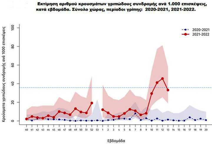 Όπως αναφέρεται στην έκθεση, οι επισκέψεις σε ιατρό με γριπώδη συνδρομή (συμπτώματα που μοιάζουν με εκείνα της γρίπης), παρουσιάζουν μείωση σε σχέση με την προηγούμενη. Η τάση αποτυπώνεται στο γράφημα που ακολουθεί.