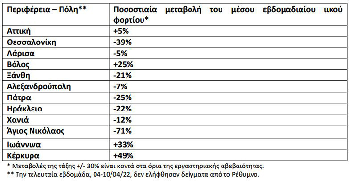 Καθαρά πτωτικές τάσεις παρατηρήθηκαν στη Θεσσαλονίκη (-39%) και στον Άγιο Νικόλαο (-71%), ενώ οριακή ήταν η μείωση στα Χανιά (-12%), στην Ξάνθη (-21%), στο Ηράκλειο (-22%) και στην Πάτρα (-25%).