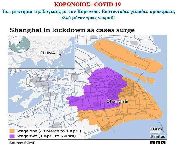 - Σανγκάη: Καταγράφηκαν οι τρεις!! πρώτοι θάνατοι μετά από χιλιάδες κρούσματα. Και το γεγονός αυτό επιτρέπει σε πολλούς να αμφιβάλλουν τα αναληθή στοιχεία που ανακοίνωναν οι Κινέζοι (2020 και 2021). ΄Ετσι κυκλοφορούν διάφορες θεωρίες, όπως: Οι Κινέζοι έχουν εντοπίσει μια πολύ πιο επιθετική παραλλαγή του κορωνοϊού ή μας κρύβουν πάλι κάτι οι Κινέζοι; Ο χρόνος θα δείξει, όπως στο τέλος του 2020 και στις αρχές του 2021, ότι η Ιατρική κοινότητα ή οι Κινέζικες αρχές αποκρύπτουν ακόμη μια φορά την αλήθεια από τον υπόλοιπο κόσμο, που είναι υποχρεωμένοι να γνωστοποιούν σύμφωνα με διεθνείς συμβάσεις για μολυσματικές ασθένειες.