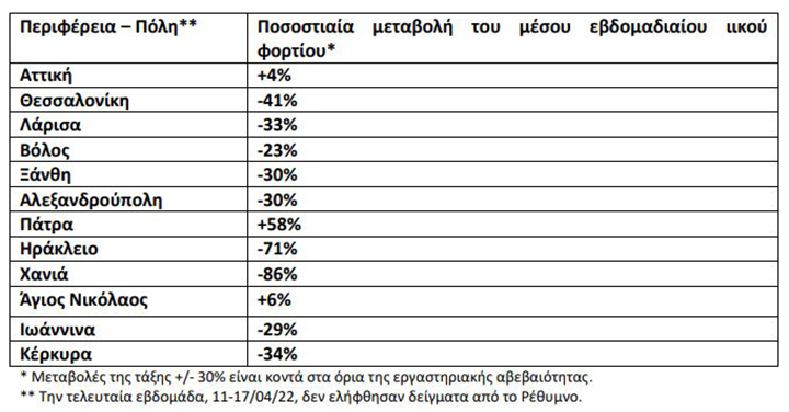 Καθαρά πτωτικές τάσεις παρατηρήθηκαν στα Χανιά (-86%), στο Ηράκλειο (-71%), στη Θεσσαλονίκη (-41%), στην Κέρκυρα (-34%) και στη Λάρισα (-33%).