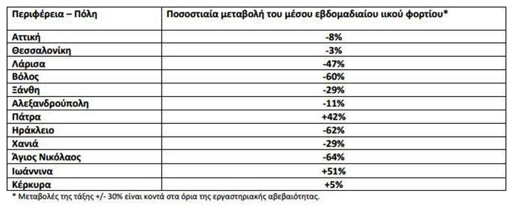 Καθαρά πτωτικές τάσεις παρατηρήθηκαν στον Άγιο Νικόλαο (-64%), στο Ηράκλειο (-62%), στον Βόλο (-60%) και στη Λάρισα (-47%), ενώ οριακή ήταν η μείωση στην Ξάνθη (-29%), στα Χανιά (-29%) και στην Αλεξανδρούπολη (-11%).
