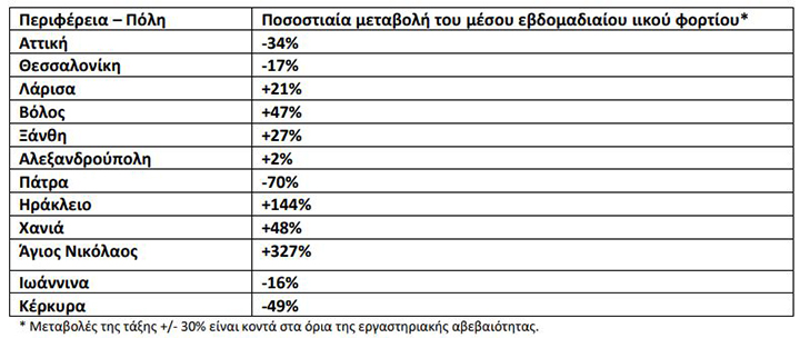 Καθαρά πτωτικές τάσεις παρατηρήθηκαν στην Πάτρα (-70%), στην Κέρκυρα (-49%) και στην Αττική (-34%). Οριακή ήταν η μείωση στη Θεσσαλονίκη (-17%) και στα Ιωάννινα (-16%).