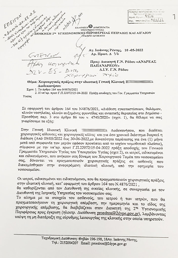 Στο έγγραφο, που παρατίθεται πιο κάτω, επισημαίνεται πως στη συγκεκριμένη κλινική Δωδεκανήσου "δύνανται να πραγματοποιούν χειρουργικές πράξεις σε ασθενείς που διακομίστηκαν στην αναφερόμενη ιδιωτική κλινική, από την εφημερία του νοσοκομείου"...