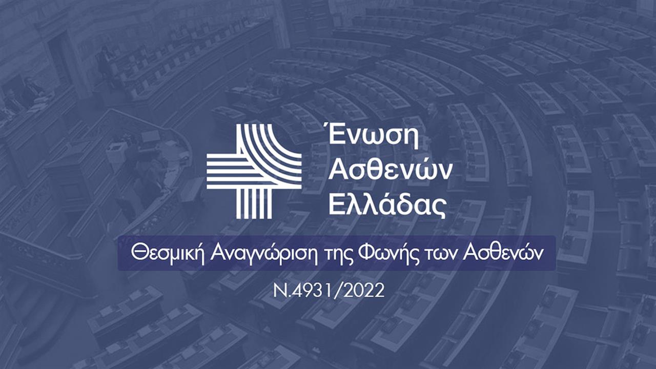 Η Ένωση Ασθενών Ελλάδας υποδέχεται με ικανοποίηση τη θεσμοθέτηση της «φωνής των ασθενών», η οποία αποτελεί ιστορική μέρα για το κίνημα των ασθενών στην Ελλάδα και πρωταρχικό στόχο από τη στιγμή της ίδρυσής της. Πρόκειται για το Άρθρο 60 του Νόμου 4931/2022, το οποίο ψηφίστηκε την Τετάρτη 11 Μαΐου 2022, από την Ολομέλεια της Βουλής και αποτέλεσε εισήγηση του Υπουργού Υγείας, κ. Θάνου Πλεύρη.
