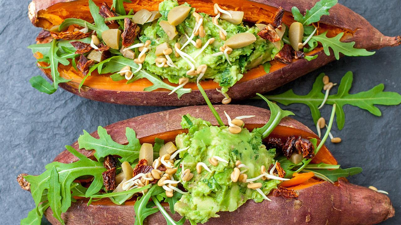 Οι γλυκοπατάτες είναι πιο θρεπτικές από τις κανονικές πατάτες, περιέχουν μεγαλύτερη ποσότητα βιταμινών και φυτικών ινών, και λόγω της ιδιαίτερης γεύσης τους μπορούν να συνδυαστούν με τα πάντα. Ψήστε μια ανοιγμένη γλυκοπατάτα, λιώστε το εσωτερικό της και αναμείξτε το με τα αγαπημένα σας λαχανικά, μυρωδικά και με μια πηγή πρωτεΐνης (από φασόλια μέχρι κοτόπουλο που έχει μείνει από την προηγούμενη ημέρα).