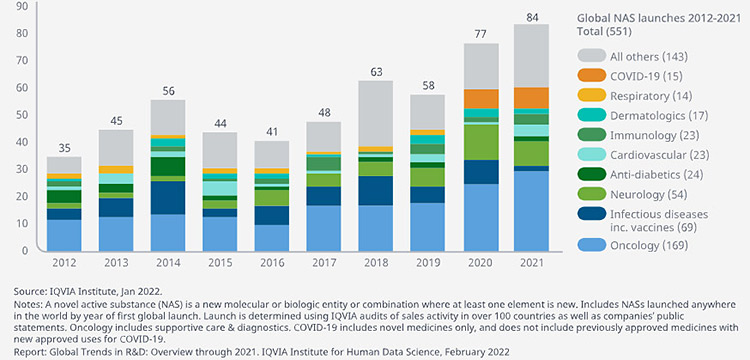 Οι ΗΠΑ παραμένουν η χώρα με τον πιο πρώιμο και τον υψηλότερο αριθμό νέων δραστικών ουσιών και μεταξύ των 72 που κυκλοφόρησαν το 2021, οι 44 ουσίες (πάνω από 60%) χαρακτηρίστηκαν από τον FDA ως πρώτης γραμμής και περισσότερες από τις μισές έλαβαν την ονομασία ''ορφανή'' που υποδεικνύει τη χρήση τους σε ασθενείς με σπάνιες ασθένειες.