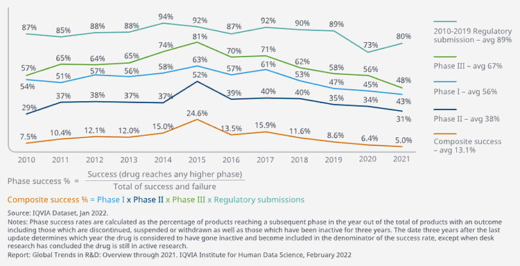 Σε όλους τους τομείς ασθενειών, η πιθανότητα επιτυχίας ποικίλλει σημαντικά και το σύνθετο ποσοστό επιτυχίας του 2021 έπεσε κάτω από την τάση των 10 ετών σε όλους τους τομείς εκτός από τα εμβόλια και τα καρδιαγγειακά.
