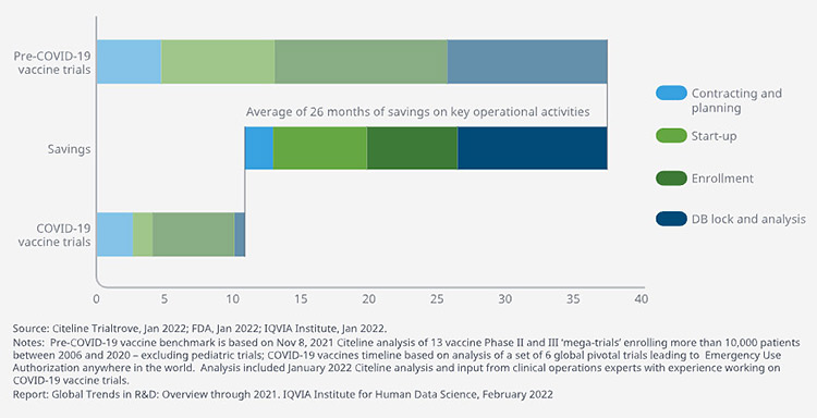 Η συνολική δραστηριότητα κλινικών δοκιμών διατηρήθηκε κατά τη διάρκεια της πανδημίας, καθώς η βιομηχανία είχε προσαρμοστεί στην επίπτωση και ανέπτυξε νέες προσεγγίσεις για να επιτρέψει τη συνέχιση της έρευνας. Το 2021 αναφέρθηκαν 5.500 νέες προγραμματισμένες ενάρξεις κλινικών δοκιμών, αυξημένες κατά 14% σε σχέση με το 2020 και 19% υψηλότερες από το 2019.