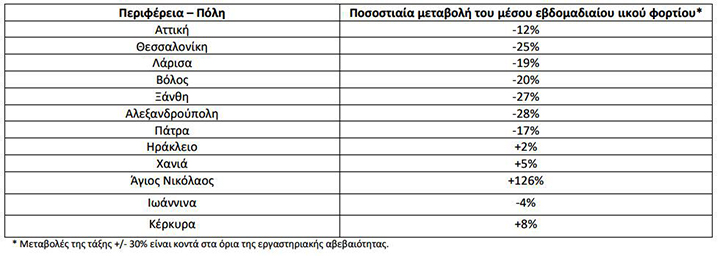 Οι πτωτικές τάσεις που παρατηρήθηκαν ήταν οριακές και παρατηρήθηκαν στην Αλεξανδρούπολη (-28%), στην Ξάνθη (-27%), στη Θεσσαλονίκη (-25%), στον Βόλο (-20%), στη Λάρισα (-19%), στην Πάτρα (-17%) και στην Περιφέρεια Αττικής (-12%).