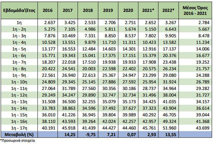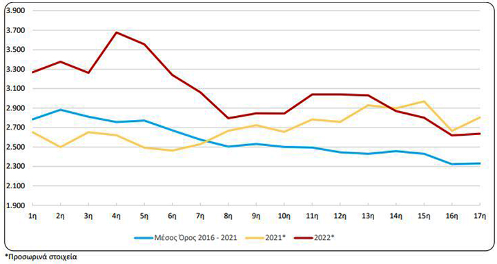 Οι μεγαλύτερες αυξήσεις καταγράφηκαν τη 2η εβδομάδα του 2022 (10 έως 16 Ιανουαρίου), την 4η εβδομάδα (24 έως 30 Ιανουαρίου), την 5η εβδομάδα (31 Ιανουαρίου έως 6 Φεβρουαρίου), με ποσοστά αύξησης 35,1%, 40,3% και 42,6%.