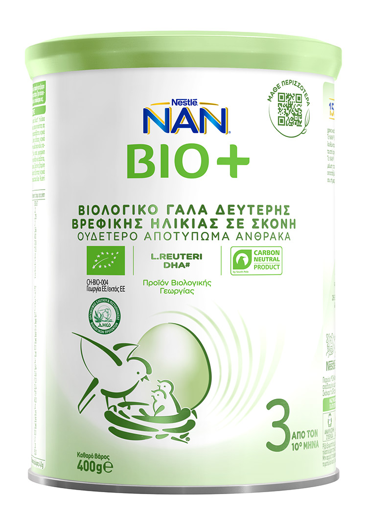 Διευρύνοντας συνεχώς τα όρια της επιστήμης για την ανάπτυξη των πιο προηγμένων διατροφικών λύσεων προσαρμοσμένων στις ανάγκες όλων των μωρών, η Nestlé παρουσιάζει το NAN BIO+, τo πρώτο και μόνο βιολογικό βρεφικό γάλα 2ης βρεφικής ηλικίας πιστοποιημένο όχι μόνο για τη βιολογική του σύνθεση αλλά και για το ουδέτερο αποτύπωμα άνθρακα, ενισχυμένο με 25 βιταμίνες και μέταλλα για να υποστηρίξει τη σωστή ανάπτυξη του παιδιού.