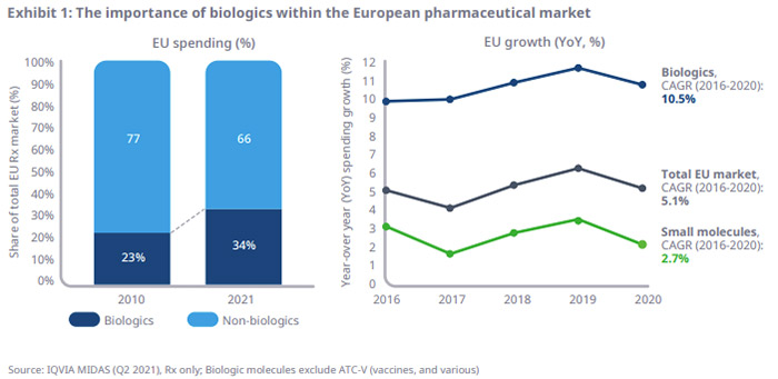 Στην Ευρωπαϊκή Ένωση, τα βιολογικά προϊόντα αντιπροσωπεύουν το 34% των δαπανών σε φάρμακα με βάση τις τιμές καταλόγου, και αυτό αυξάνεται με ετήσιο ρυθμό 10,5%. Ποσοστό που είναι υπερδιπλάσιο για τη συνολική αγορά, η οποία περιλαμβάνει φάρμακα μικρού μορίου συν βιολογικά και βιο-ομοειδή, ανέφερε η IQVIA.