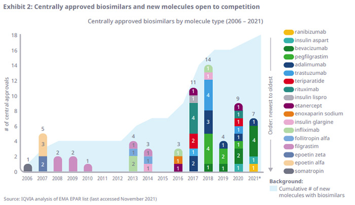 Η εταιρεία αναγνώρισε την πανδημία ως πρόκληση για ορισμένα στοιχεία της αγοράς βιολογικών προϊόντων, αλλά είπε ότι η Ευρωπαϊκή Ένωση, τουλάχιστον, δεν έχει καθυστερήσει τις εγκρίσεις νέων βιο-ομοειδών. «Από κανονιστική άποψη, ο Ευρωπαϊκός Οργανισμός Φαρμάκων συνέχισε να έχει καλές επιδόσεις όσον αφορά την έγκριση καινοτόμων φαρμάκων και βιο-ομοειδών. Υπήρχαν τουλάχιστον 7 νέα βιο-ομοειδή που εγκρίθηκαν στην Ευρωπαϊκή Ένωση το 2021, έναντι 9 που εγκρίθηκαν το 2020, ανέφερε η IQVIA.