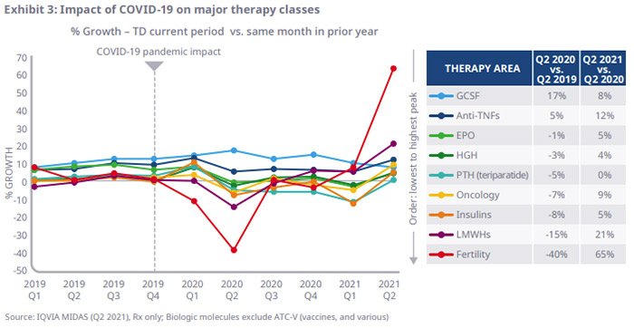 Παράγοντες που σχετίζονται με την πανδημία που παρεμπόδισαν την αύξηση των πωλήσεων φαρμάκων το 2021 περιελάμβαναν τη δυσκολία διεξαγωγής διαπροσωπικών διαβουλεύσεων με ασθενείς/ιατρούς και τη δυσκολία αλλαγής συνταγών σε βιο-ομοειδή ή έναρξης ασθενών με αυτά.