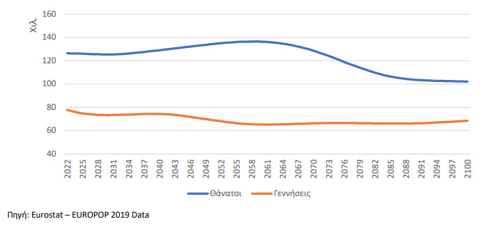 Στο βασικό σενάριο προβολών της Eurostat, ο αριθμός γεννήσεων σταθεροποιείται στο εύρος 73-75 χιλ. έως τα μέσα της δεκαετίας του 2040, για να υποχωρήσει στη συνέχεια σε περίπου 66 χιλ. από τα τέλη της δεκαετίας του 2050. Ο αριθμός των γεννήσεων υπολείπεται σημαντικά του αριθμού των θανάτων σε όλη την περίοδο πρόβλεψης. Ειδικότερα, οι θάνατοι προβλέπεται να αυξηθούν μέχρι το 2060 σε 136 χιλ., να υποχωρήσουν στη συνέχεια και να σταθεροποιηθούν σε περίπου 103 χιλ. το έτος από το 2085.