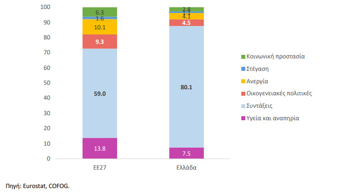 Επιπλέον, συγκριτικά με την Ευρωζώνη, η Ελλάδα βρίσκεται ψηλότερα στον δείκτη εξάρτησης της τρίτης ηλικίας σε όλη την εξεταζόμενη περίοδο, ενώ η διαφορά προβλέπεται να αυξηθεί μετά τα μέσα της δεκαετίας του 2030. Σε συνάρτηση με την πληθυσμιακή γήρανση και την υπογεννητικότητα, ο δείκτης εξάρτησης της τρίτης ηλικίας αναμένεται να αυξηθεί στο μέλλον για όλες τις χώρες της Ευρωζώνης. Στην κατάταξη των χωρών, η Ελλάδα βρίσκεται στην 3η θέση αναφορικά με τον δείκτη εξάρτησης της τρίτης ηλικίας το 2020 και στην 5η θέση το 2100, μετά την Ιταλία, τη Φινλανδία, την Ισπανία και την Μάλτα.