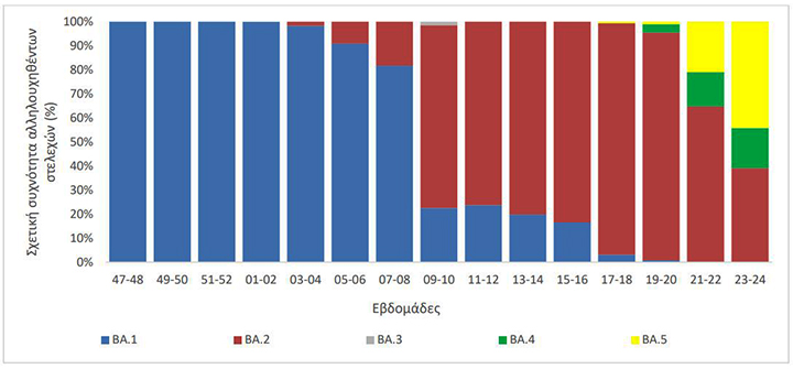 Τάσεις πλήρους επικράτησης στην Ελλάδα δείχνουν οι παραλλαγές Όμικρον 4 και 5. Σε μία εβδομάδα, αυξήθηκαν τα επιβεβαιωμένα κρούσματα κατά 132%, φτάνοντας συνολικά τα 364, από 157 το προηγούμενο επταήμερο.