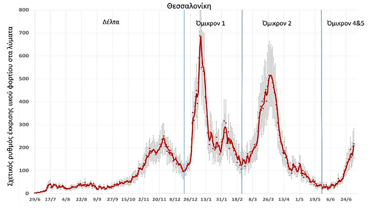 Τις τελευταίες εβδομάδες ο ρυθμός αύξησης του συνολικού ιικού φορτίου στα λύματα της Θεσσαλονίκης ήταν εκρηκτικός, καθώς γινόταν διπλασιασμός ανά 6 μέρες. Τα δεδομένα των τελευταίων 10 ημερών δείχνουν συνέχιση της έντονα αυξητικής τάσης, αλλά με κάποια μείωση του ρυθμού, καθώς ο διπλασιασμός γίνεται ανά 10 μέρες, αντί για 6. Με βάση αυτές τις μετρήσεις, ο Χρυσόστομος Δόβας προβλέπει πως πλησιάζουμε προς μια κορύφωση του επιδημικού κύματος, που αναμένεται μετά τα μέσα του μήνα. Ο ίδιος παρατηρεί πως το τρέχον κύμα μοιάζει αρκετά με αυτό της Όμικρον2 (οι Όμικρον4 και 5 αποτελούν εξελικτικούς κλάδους της Όμικρον2), ενώ εκτιμά πως οι δύο υποπαραλλαγές θα μας απασχολήσουν ξανά και το φθινόπωρο.