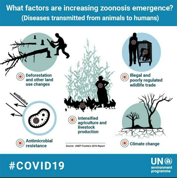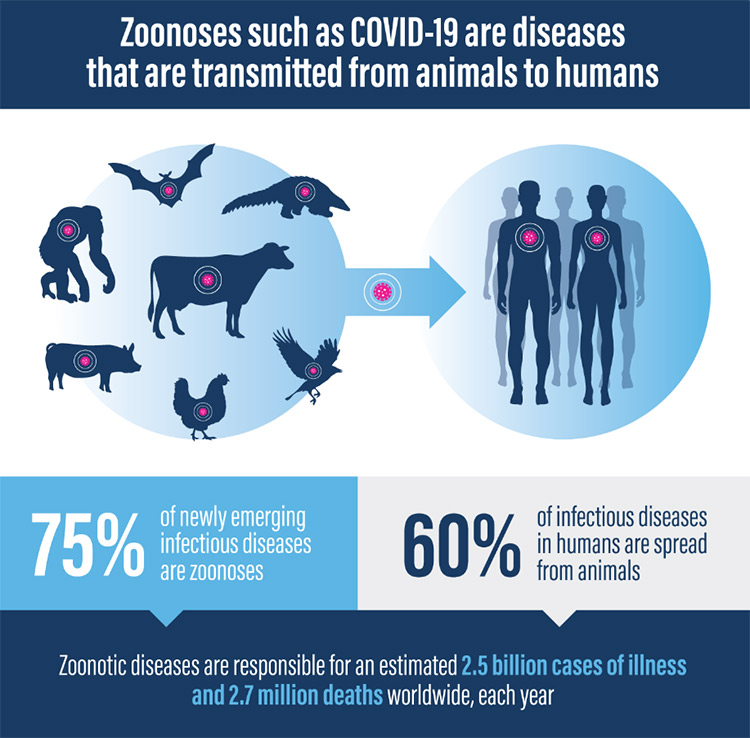 Σημειώνεται ότι ακόμη και πριν από την τρέχουσα πανδημία, υπολογίζεται ότι οι ζωονόσοι ευθύνονται για 2,5 δισεκατομμύρια περιπτώσεις ανθρώπινων ασθενειών και 2,7 εκατομμύρια θανάτους παγκοσμίως κάθε χρόνο.