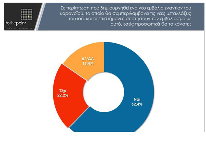 Περίπου δύο στους τρεις από το σύνολο των ερωτηθέντων (62,4%) απαντούν θετικά στο ερώτημα αν θα κάνουν το επικαιροποιημένο εμβόλιο που θα καλύπτει τις νέες μεταλλάξεις του ιού, όταν αυτό δημιουργηθεί και εφόσον συστηθεί από τους επιστήμονες. Στον αντίποδα, το 22,2% δηλώνει πως δεν θα το κάνει, ενώ το 15,4% δεν τοποθετείται.