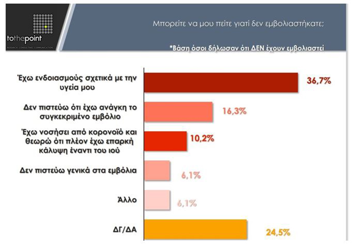 Ένας στους τρεις από όσους δεν έχουν εμβολιαστεί αναφέρει ως λόγο τους ενδοιασμούς σχετικά με την υγεία του, ενώ 1 στους 10 ότι έχει νοσήσει και θεωρεί πως καλύπτεται ανοσιακά.