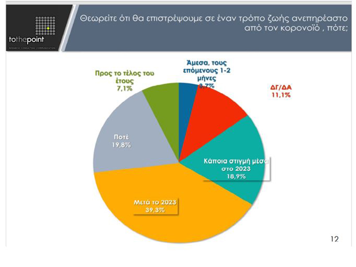 Εντύπωση προκαλούν οι απαντήσεις των πολιτών σε ό,τι αφορά το πότε βλέπουν το τέλος της πανδημίας. Σε ερώτηση πότε θα επιστρέψουμε σε έναν τρόπο ζωής ανεπηρέαστο από τον κορωνοϊό, ένας στους πέντε (19,8%) απαντάει "ποτέ". Ανάλογο ποσοστό (18,9%) βλέπει το τέλος της πανδημίας μέσα στο επόμενο έτος, ενώ η πλειοψηφία (4 στους 10) προβλέπουν πως θα την αφήσουμε πίσω μετά το 2023. Ένα συνολικό ποσοστό 10,8% εμφανίζεται πιο αισιόδοξο και προβλέπει επιστροφή στην κανονικότητα εντός του 2022: είτε μέσα στους επόμενους 1-2 μήνες (3,7%) ή προς το τέλος του τρέχοντος έτους (7,1%).