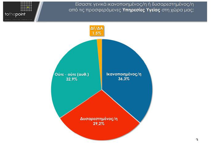 Μοιρασμένες στα τρία είναι οι απαντήσεις των ερωτηθέντων σε ό,τι αφορά το βαθμό ικανοποίησής τους από τις προσφερόμενες υπηρεσίες Υγείας στην Ελλάδα - δημόσιες και ιδιωτικές με το 36,3% να δηλώνει ικανοποιημένο, το 29,2% δυσαρεστημένο και το 32,9% ούτε το ένα ούτε το άλλο. Σύμφωνα με τον κ. ίτσα, καταγράφεται αύξηση του βαθμού ικανοποίησης και μείωση της δυσαρέσκειας σε σχέση με προηγούμενες μετρήσεις, κάτι που ο ίδιος απέδωσε στην υπευθυνότητα που επέδειξε το υγειονομικό προσωπικό στη διάρκεια της πανδημίας.