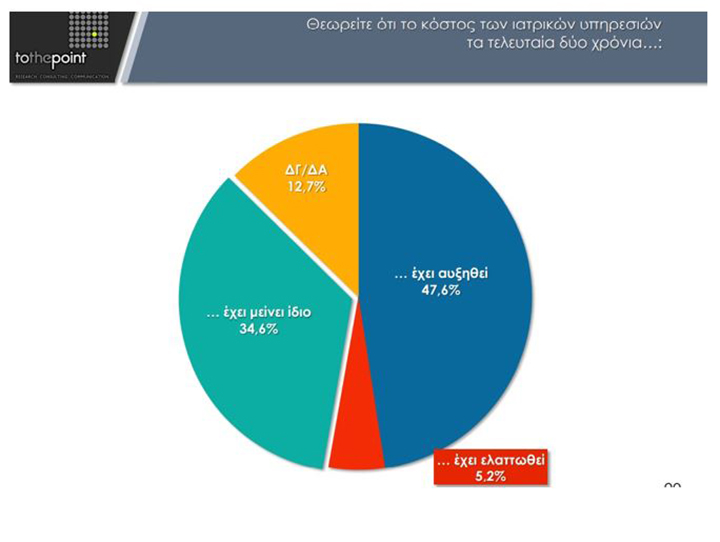 Περίπου οι μισοί ερωτηθέντες (47,6%) απαντούν πως το κόστος των ιατρικών υπηρεσιών έχει αυξηθεί τα τελευταία δύο χρόνια, κάτι που σύμφωνα με τον πρόεδρο του ΙΣΘ δεν απαντά σε αύξηση των αποδοχών του προσωπικού.