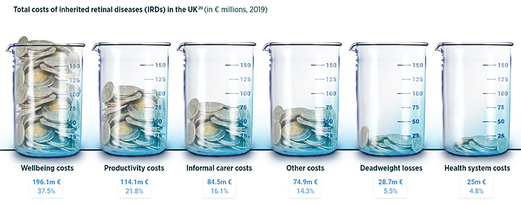 Η σχέση κόστους-αποτελεσματικότητας αξιολογείται συνήθως με βάση την άμεση οικονομική επιβάρυνση μιας ασθένειας στο σύστημα υγείας. Ωστόσο, ο μεγαλύτερος αντίκτυπος πολλών γενετικών ασθενειών είναι έμμεσος — η κληρονομική τύφλωση, για παράδειγμα, είναι δαπανηρή για το άτομο, την οικογένειά του και τους φροντιστές του, και το μεγαλύτερο κόστος επιβαρύνει το κοινωνικό σύστημα και το σύστημα πρόνοιας και όχι τις κλινικές και τα νοσοκομεία. Μια ανασκόπηση της Deloitte υπολόγισε το συνολικό κόστος που αποδίδεται σε κληρονομικές ασθένειες του αμφιβληστροειδούς -διαμορφώθηκε σε 523,3 εκατ. λίρες το 2019, σε σχέση με το οικονομικό κόστος και το κόστος ευημερίας, ενώ το κόστος που επιβαρύνθηκε το σύστημα υγείας ήταν το χαμηλότερο.