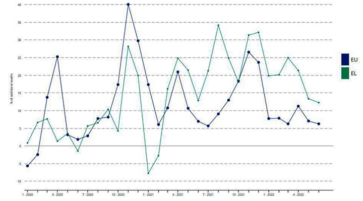 Η παρατηρούμενη βελτίωση δεν μπορεί - ούτως ή άλλως - να θεωρηθεί ικανοποιητική, καθώς ο δείκτης διατηρεί θετικό πρόσημο, ενώ η χώρα μας έχει διπλάσια αύξηση της υπερβάλλουσας θνητότητας σε σχέση με τον μέσο ευρωπαϊκό όρο, όπως δείχνει και το γράφημα που ακολουθεί (η Ελλάδα με πράσινο).