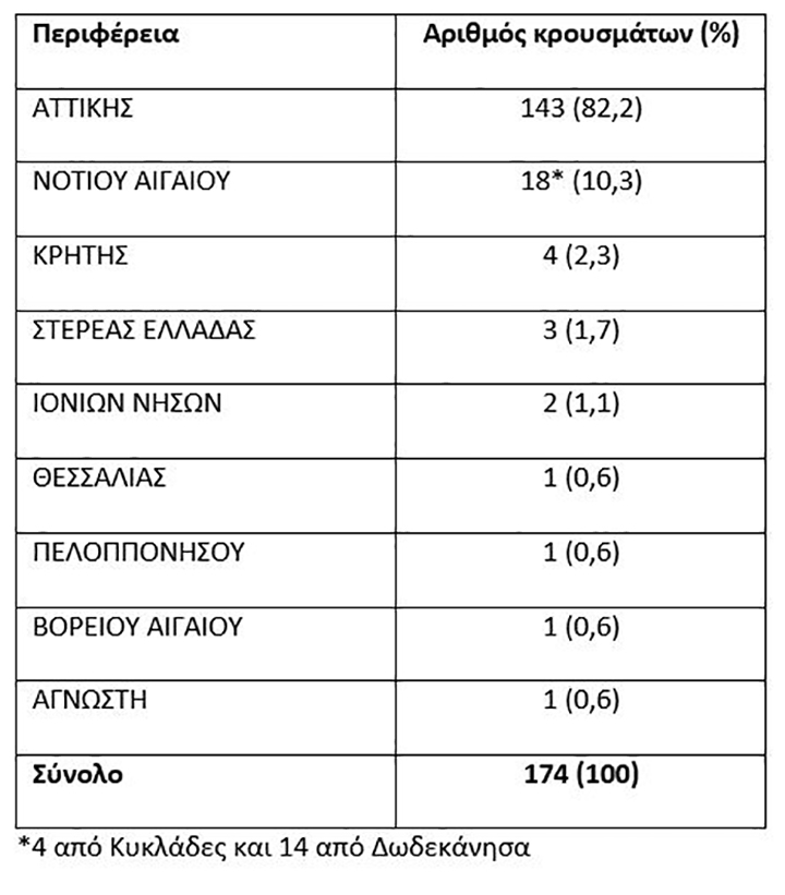 Ενενήντα τέσσερα κρούσματα (80,3%) είχαν ταξιδέψει στις Κυκλάδες, 9 (7,7%) στο Ν. Αιγαίο, 8 (6,8%) στο Ιόνιο, 3 (2,6%) στο Β. Αιγαίο και 3 (2,6%) σε προορισμούς της Ηπειρωτικής Ελλάδας.
