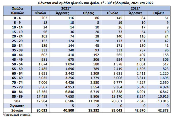 Σύμφωνα με τα στοιχεία, η αύξηση δεν περιορίζεται στην τελευταία διετία, αλλά είναι της τάξης του 15,42% σε σχέση με το μέσο όρο των πρώτων 30 εβδομάδων της εξαετίας 2016 - 2021 (73.684 θάνατοι).