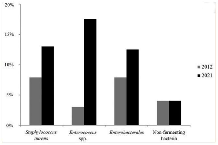 Από τα 295 κινητά τηλέφωνα που ελέγχθηκαν μικροβιολογικά (196 το 2021 και 99 το 2012), βρέθηκε βακτηριακή ανάπτυξη στα 293. Οι πηκτάση αρνητικοί σταφυλόκοκκοι (CNS) ήταν η πιο κοινή ομάδα απομόνωσης και στις δύο περιόδους μελέτης, καθώς ανιχνεύτηκαν στο 88,5% των συσκευών το 2012 και στο 75% το 2021.