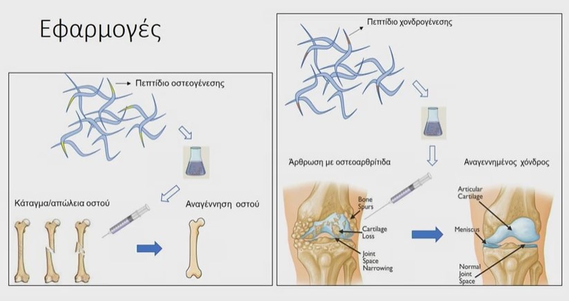 "Αντί ο γιατρός να παίρνει δύο φιαλίδια, να τα αναμειγνύει και να τα βάζει πάνω σε ένα πολύ λεπτό τμήμα ειδικού σφουγγαριού που πωλείται από εταιρείες, ώστε στη συνέχεια να το βάζει στα κατάγματα, μπορεί να βάζει το δικό μας υλικό και να δημιουργεί οστικά κύτταρα", λέει και προσθέτει: "Στα δικά μας τα σφουγγάρια, εσωκλείουμε ολόκληρες της πηκτές σε συνεργασία που έχουμε κάνει με το Τμήμα Χημικών Μηχανικών και μπορεί ο ορθοπαιδικός με μια λαβίδα να παίρνει αυτό το ειδικό πολύ λεπτό hansaplast σε νανοδιαστάσεις που οδηγεί σε οστική αναγέννηση".
